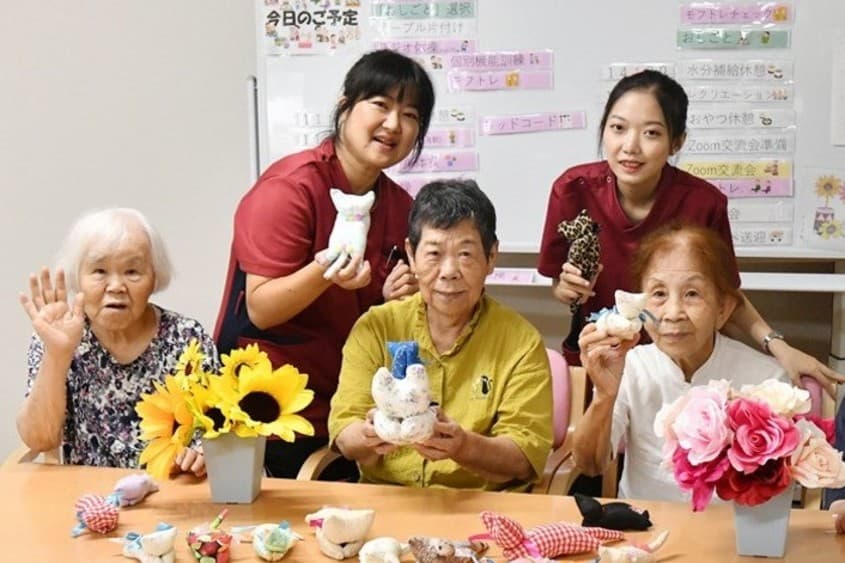 フレイル予防型デイサービス星の子まなびやでは、利用者さまの意欲を引き出し、楽しく過ごすためのサポートができます。日々、同じように過ごすだけではマンネリ化してしまうため、積極的に新しい活動を導入。これまでには、法人内の他事業所とのZoom交流会を開催し、レクリエーションを行って利用者さまの交流範囲を広げました。新しい体験の提供を通して、利用者さまの日常に活力を与えられるのが魅力です。 また、当施設は利用者さまが社会貢献を実感できる機会を作り出しています。退職後に意欲をなくしがちな方が多い背景から、「社会の役に立っている」ということを感じられる作業活動を提供。猫のマスコットづくりやボールペンの袋詰めに取り組んでいただいています。ただ1日を過ごすのではなく、役割を持って生活してほしいというのが職員たちの思いです。なかには、「針仕事ができたから編み物にも挑戦しよう」とステップアップする方もいます。利用者さまから「またやりたい」という声を聞くことが、職員にとっての大きなやりがいです。