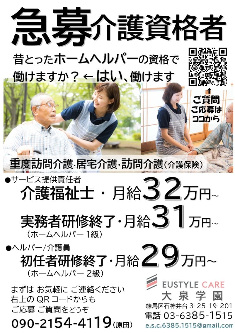 🌟 「もっと自由に、もっと良い介護をつくりたい」 その想いをカタチにできる職場です💡 🚀 キャリアアップも現実的! まずは現場を知るところからスタート✨ その後は「育成・管理業務」へとステップアップ! 👉 サービス提供責任者 → 管理職 へのキャリアも目指せます💪 ✅ こんな方にピッタリ! ・新しい環境でチャレンジしたい🔥 ・経験を活かしてスキルを磨きたい📚 ・スタートアップに携わりたい🚩 ・障がい福祉や医療的ケアに興味がある💉 📣 応募ハードルは高くありません! 「気になる」だけでもOK👌 「ちょっと話を聞いてみたい」そんなお気持ちでも大歓迎です🌈 ✨ あなたの一歩を、私たちは全力で応援します ✨ ✨==✨====👌✨==✨====👌✨==✨====👌 2025年11月開設の新しい事業所です。あなたの経験を活かして、働きやすいく、従事者とそのご家族が満足な環境と制度を目指して、毎日善処していきましょう。 事業所は東京都練馬区の石神井台3丁目にあります。西武池袋線 大泉学園駅から徒歩12分です。とても静かな住宅地で、晴れた日は窓やカーテンを開け、太陽の光と小鳥たちのさえずりを愉しめます。 仕事の合間に立ち寄れて、仲間とおしゃべりをしたり、昼寝をしてㇼスレッシュできる自由空間です。フリーWiFi、フリーcoffeeですので、ぜひ一度、見学がてらくつろぎにお寄りください。(来る前にはお電話1本お願いします。外出不在の場合もあるので…)