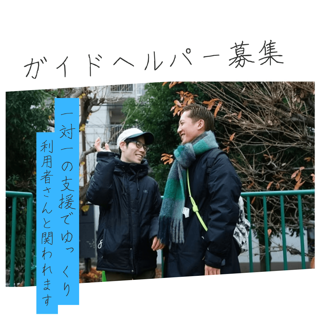 ⭐︎-主に目黒区、世田谷区や隣接する区にお住まいの障がいがある方の自宅に伺い、身体介護を中心に掃除・洗濯・買い物などの日常生活のサポートを行います。 障がいがある方の通学や通所の送迎支援、余暇などの外出に付き添います。 介護に伴う事務作業にも従事します。 1日あたりの訪問件数は2~3件前後です。 心配な業務(料理が苦手、ケガをしているので入浴介助が心配など)があれば面接の際に相談し、任せるエリアやご利用者を調整します。 初回はサービス提供責任者や管理者と一緒に同行訪問を行います。 訪問介護の経験豊富なベテラン職員が管理者を務めているため、わからないことや心配なことがあれば安心して頼ることができます。