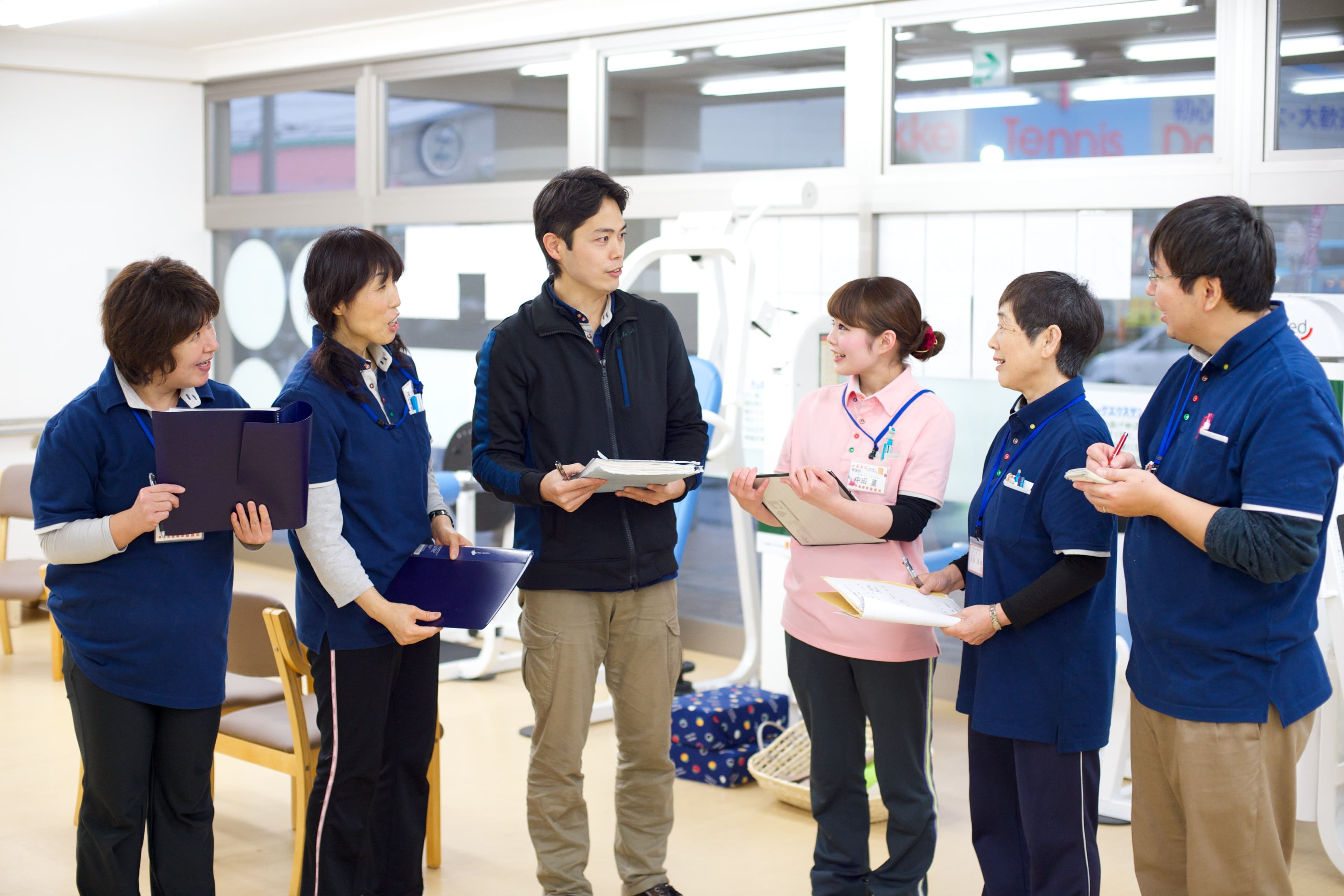 リハプライド・なりますの自慢は、どんなことでも話し合える職員同士の関係性の良さです。スーパーの話やK-POP、映画の話題など、日常的にたわいない会話を繰り広げています。温かな雰囲気が流れている職場なので、新人さんも緊張することなく馴染んでいけるはずです。 また、職員同士の活発な交流が職種の垣根を越えたサポート体制を実現。介護職が利用者さまの体調の変化に気づき、すぐに看護師へ報告するといった連携が自然に行われています。ほかにも、介護職がバイタル確認のサポートに入ったり、看護師が利用者さまの見守りを行ったりと、柔軟な業務分担を実践。役割を厳密に区切り過ぎない当事業所の文化が職員同士の「支え合いの精神」を生み出しています。穏やかな雰囲気のなかで働けるからこそ一人ひとりに心のゆとりが生まれ、チーム連携の好循環につながっています。