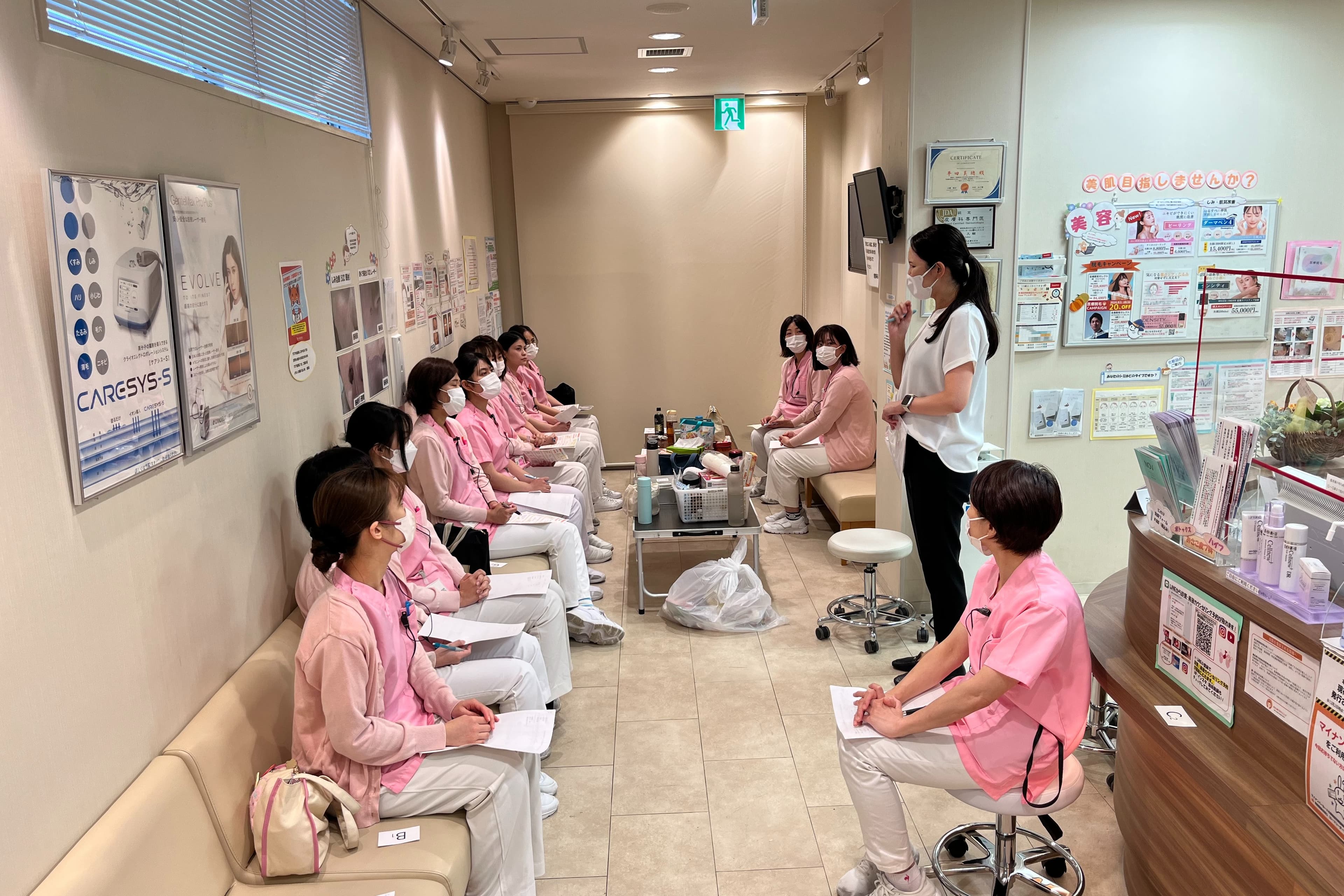 さかい皮フ科クリニックは、OJTを基本とした研修を実施しています。指導係がマンツーマンで丁寧に教えるため、皮膚科での勤務が未経験の方も安心です。また、業務手順をまとめたマニュアルや教育動画も完備しており、共有フォルダからいつでも自分のタイミングで復習が可能。接遇コンサルタントによるマナー研修や最新設備のデモ講習など、専門知識を深める機会もあり、着実にステップアップできる環境を整えています。 当院は美容皮膚科ならではの福利厚生が充実しており、美容施術が半額で受けられるほか、クリニック専売の化粧品も原価で購入可能です。自ら効果を体感することで、患者さまへ説得力のあるアドバイスが可能になります。美容医療の知識を深めながら、自分磨きも楽しめる職場です。