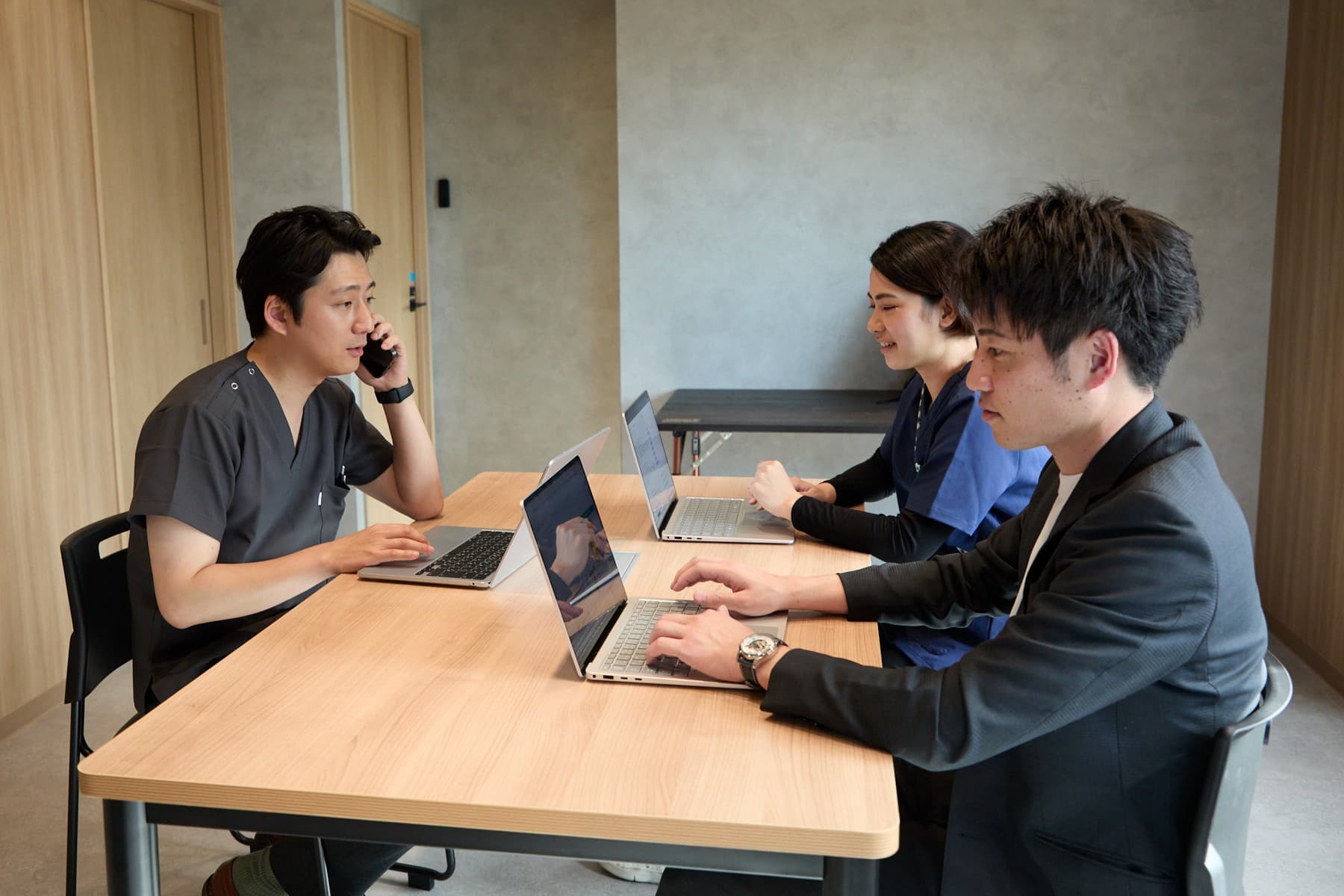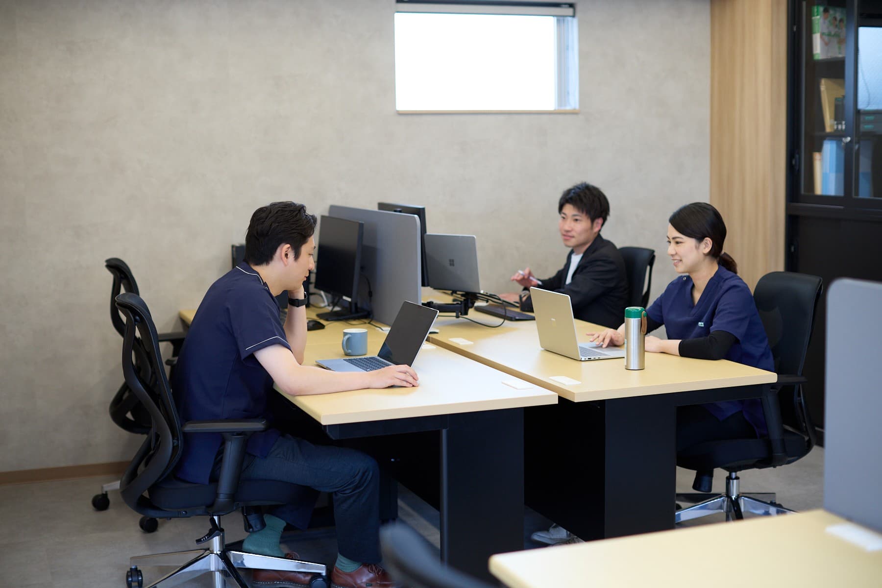 ゼロイチ在宅クリニックには、職員が仕事と私生活のバランスを保ちながら働ける環境が整っています。年間休日は120日以上と多めで、基本的に土曜日と日曜日はお休みです。祝日に出勤した場合は代休を取る体制を完備しています。また、有休はほぼ希望どおりに取得でき、事前に相談したうえで土日とあわせて連休希望を出すことも可能です。休みをしっかり確保できるため、プライベートの充実が叶います。 また、シフト調整についても柔軟に対応しているため育児中の方も働きやすい職場です。当事業所では、学校行事やお子さまの急な発熱など家庭の事情を優先する風土が根付いています。ライフステージに変化があっても長く働き続けやすい点が魅力です。 当事業所は、職員の業務負担を軽減するためにICT化を推進しています。1人に1台スマートフォンとパソコンを貸与し、訪問診療先でも事務作業ができるように設定。結果、事務所に戻ってから行う業務が減り、残業時間を月10時間に抑えています。同時に、事務作業の負担を減らすために書類やカルテのペーパーレス化を実施。効率的に業務に取り組める体制です。