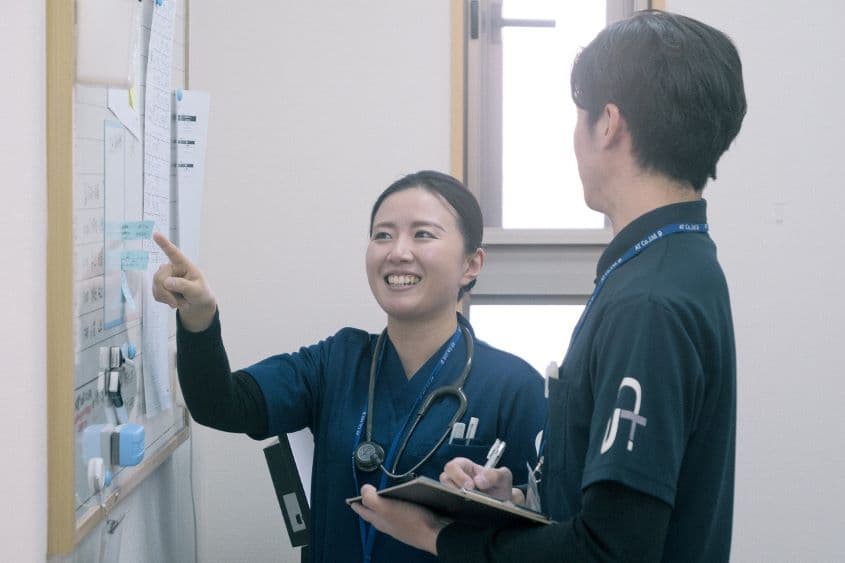 多職種が活躍する現場ですが、職種間の隔たりがなく、何かあれば誰にでも相談できるところが魅力です。多職種のスタッフが同じ目線でご利用者さまを見て、お互いに足りない部分を補い合いつつ最善のアプローチにつなげることができます。 また、専門職のスタッフが訪問に専念できる環境が整っているところも魅力です。各事業所には事務スタッフが配置されています。書類業務は事務スタッフによるダブルチェックが入る体制が整っており、万が一自分が作成した書類に不備があった場合でも、見落としを拾い上げてくれるのでとても助かっています。