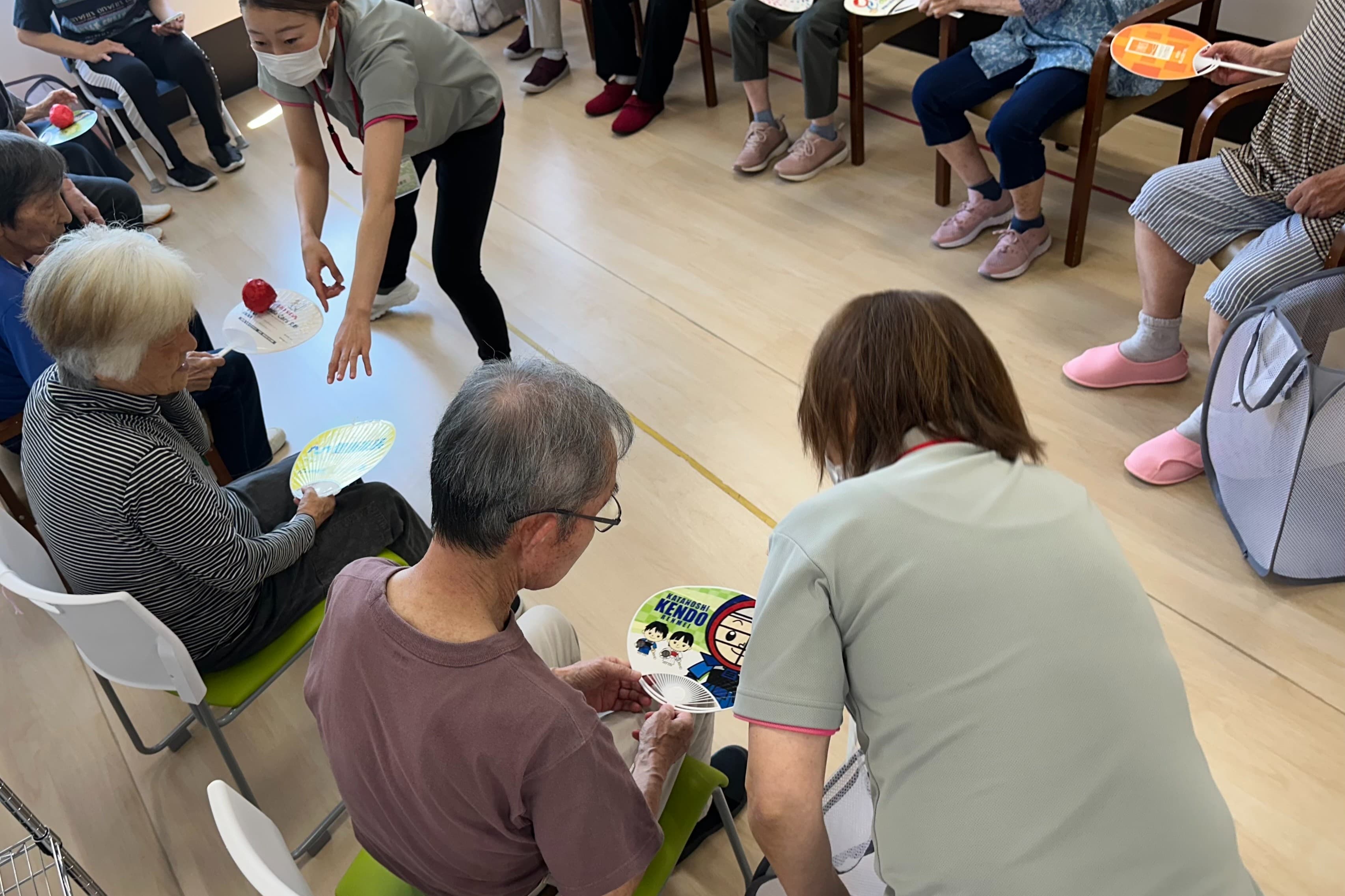 毎年開催される夏祭りでは、私たちもフロアにてたこ焼きやスイカを屋台風に並べて提供しています。利用者さまの楽しまれている姿を近くで見て、一緒に雰囲気を楽しめることがうれしいですね。