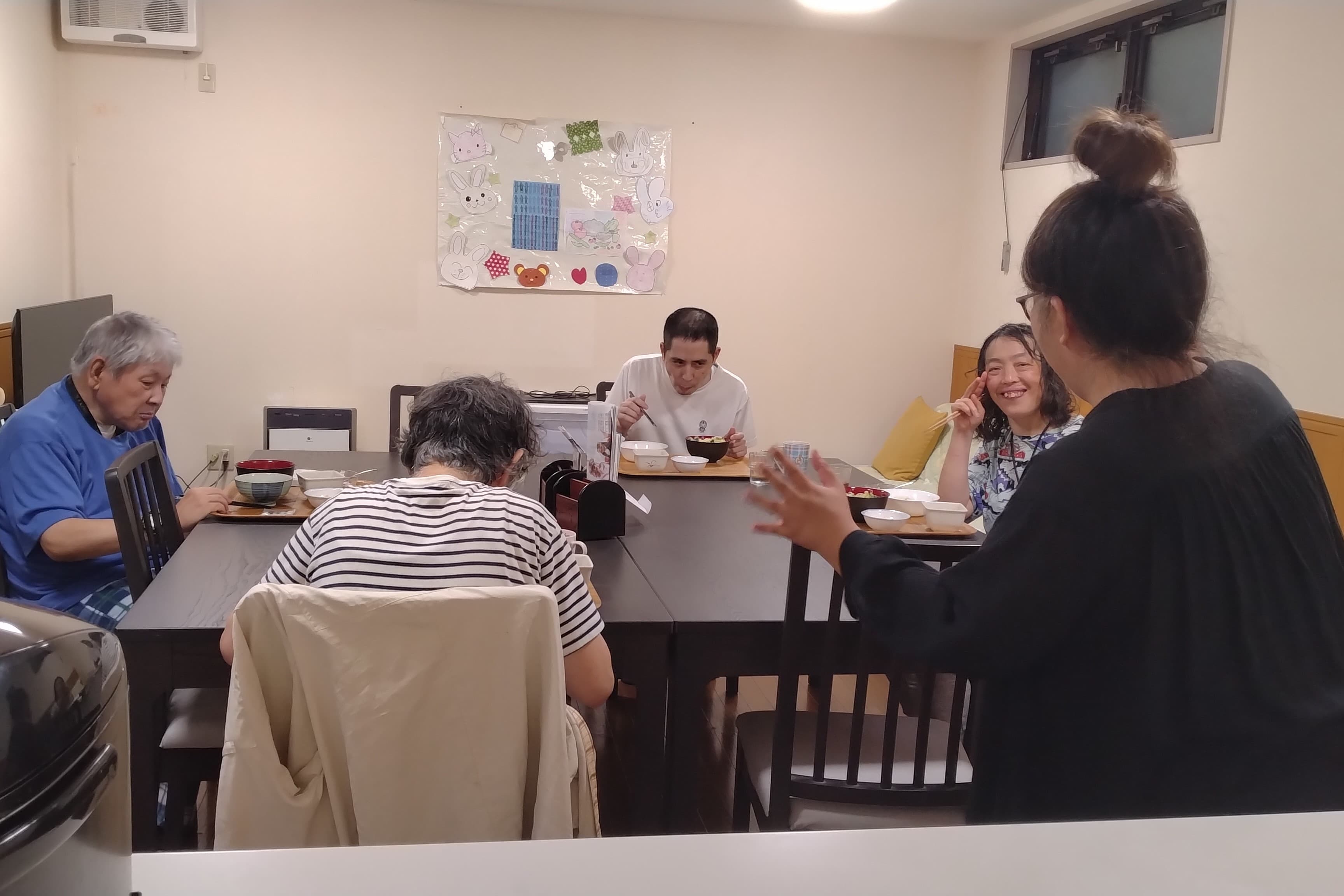 入職前にwebサイトで見た写真のとおり、家族のような温かい雰囲気の施設でした。 えびす・ぱれっとホームでは、職員と入居者さまの間にはっきりした線引きがなく、友達あるいは家族のような関わり方が出来ています。