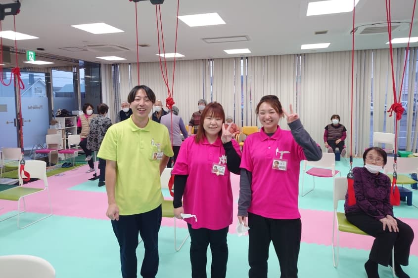 カラダラボ石狩花川は、北海道石狩市にあるリハビリ特化型のデイサービス施設です。1日のうち、午前・午後でそれぞれ20〜30名の利用者さまが来所され、主な年齢層は70〜80代。中には90代の利用者さまもいらっしゃいます。 一人ひとりの目標に合わせた運動メニューを提案している点が当事業所の特徴です。職員は、普段から利用者さまに笑顔で接することを大切にしており、「自分たちが笑顔で接すれば、利用者さまも自然と笑顔になれる」と考えています。 当施設では、職員全員で利用者さまのためにできることを考えており、より良いサービスを提供するための提案はいつでも大歓迎。職員自ら積極的に運動メニューを考えたり、ミーティングの際に意見を出したりしやすい環境です。自分の提案や対応によって、利用者さまから「ありがとう」という言葉をいただける瞬間が職員にとって何よりのやりがい。考えたメニューがうまくいったときや、逆にうまくいかないときでも、利用者さまの笑顔に救われながら楽しく働けることが当施設の魅力です。